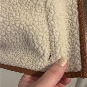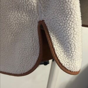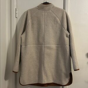 Stay warm and stylish with this cozy cream sherpa coat. Perfect for chilly days, this coat offers both comfort and elegance. Size large. Minor tear at the zipper seam, barely noticeable but could easily be sewn.