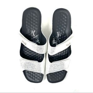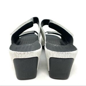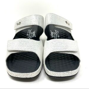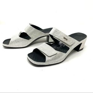 The velcro allows precise adjustment of the sandal to your feet. Fitting in perfection! The soft massage nubs ensure more than just a massage of the sole of the foot: exactly adjusted to the reflex zones of the foot, they communicate with the whole human body, and so ensure wellbeing and comfort. We use first class natural leathers. They are breathable, skin friendly and humidity regulating. The embossed leather give an extra fashionable look. The absorption of every step, thanks to the use of high quality PU foams, gives the foot as a whole a good feeling, just as much as the anatomical adjustment of the footbed. Fashionable 6cm heel, 4cm arch, width F 1/2 The elegant Accessoire gives additonal chic to this shoe.