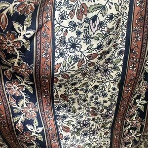 Features: Paneled design, triangle cups, plunging V-neckline, crocheted cutouts, double straps with adjustable cross-back tie, front slits, floral print, low dipped back