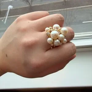 Preowned and gently worn. The ring remains in excellent overall condition with normal light signs of wear consistent with careful use. Pearls are lustrous and intact, and diamonds are secure and sparkling.