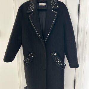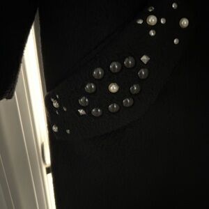 Coach collection mohair and wool blend coat in black features a sophisticated oversized silhouette with striking embellishments. This single-breasted piece is adorned with a mix of studs and faux pearls along the notched lapels and pocket flaps, offering a modern edge to a classic design. Crafted from a textured fuzzy fabric, it includes a smooth viscose lining and a gold-tone chain locker loop for a touch of luxury. The coat is finished with two front buttons and flap pockets, making it a standout addition to any cold-weather wardrobe.
