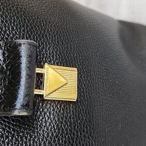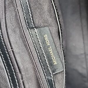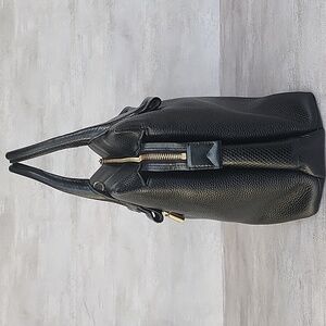 Missing adjustable strap, zip top closure, soft black suede like lining. 2 leather handles with a 3.75" drop.