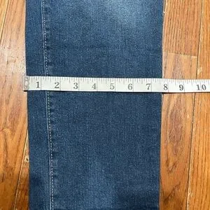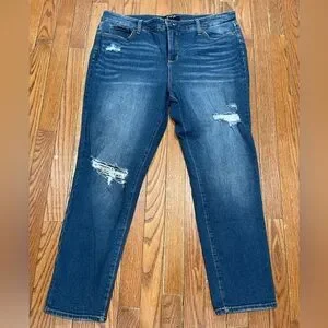 Chic dark blue jeans with distressed details. Relaxed boyfriend fit. Ideal for casual outings.