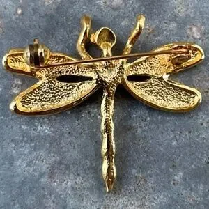 This is a lovely, gold tone dragonfly brooch w/ purple-gray and pink wings. The brooch is 1.5 inches by 1.5 inches.