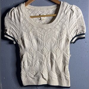 Short-sleeve, ivory sweater with a black stripe on the hem and two black stripes on the sleeves. Has a nice weight to it.