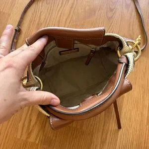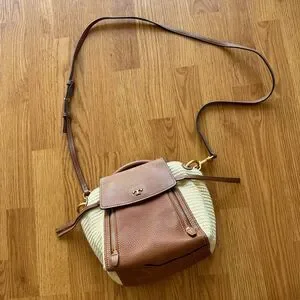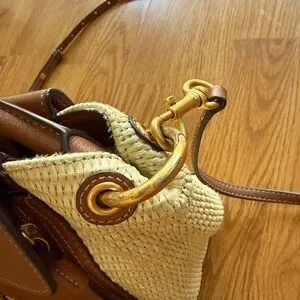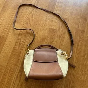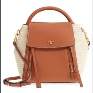 Tory Burch crossbody bag in smooth leather and woven polyurethane straw.
