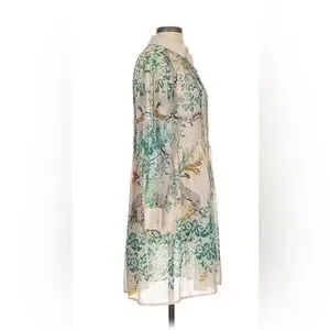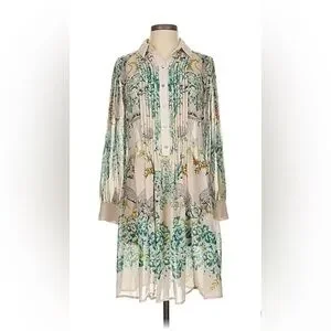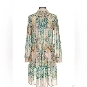 Elegant long sleeve dress with a floral pattern. Features shades of green and cream.