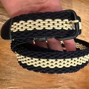 Elevate your style with this elegant black and cream woven belt. Perfect for adding a touch of sophistication to any outfit.