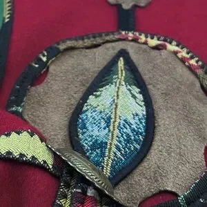 Tags Include: decorative knit top southwestern western Native American indigenous black red burgundy wine mulberry yellow green unique patchwork