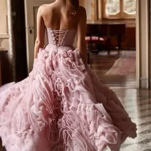 Elegant strapless dress with ruffle details. Ideal for special events.