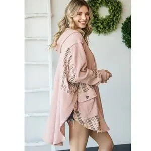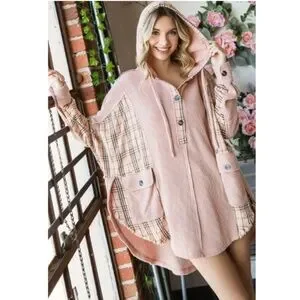 Stylish pink hoodie with plaid accents. Features button details and front pockets. Comfortable and chic design.