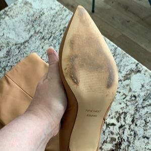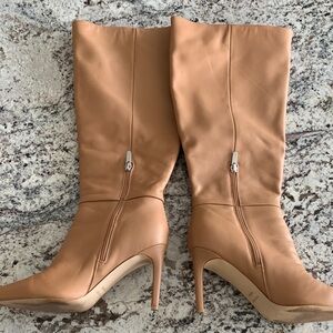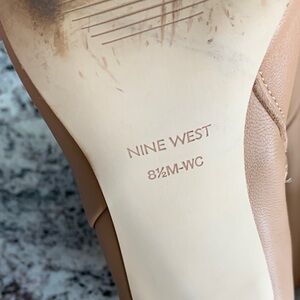 Chic tan heeled boots by Nine West. Sleek design with a pointed toe. Ideal for elevating any outfit.great condition. Bottom is a little worn only wore few times