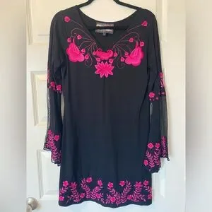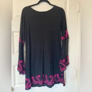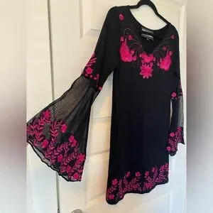 This chic black dress features stunning pink floral accents, with sheer bell sleeves. perfect for adding a pop of color to your wardrobe. Ideal for any occasion.