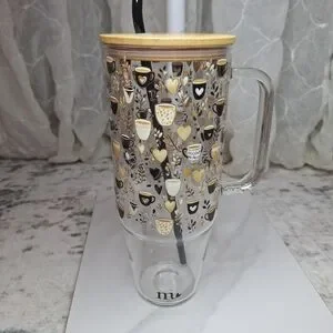 Mermaid Glass, Glass Tumbler with Handle, Iced Coffee Cup, Bamboo Lid, Glass Straw, Aesthetic Drinkware, Cup Holder Friendly, Hearts and Coffee Print, Sustainable Kitchen, Reusable Cup, Gift for Coffee Lover, Boho Kitchen, Minimalist Decor, 40oz Style Tumbler Coffee lover boutique