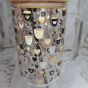 The glass is beautifully adorned with a cozy, all-over pattern of coffee cups, hearts, and botanical sprigs in a sophisticated palette of gold, cream, and black.