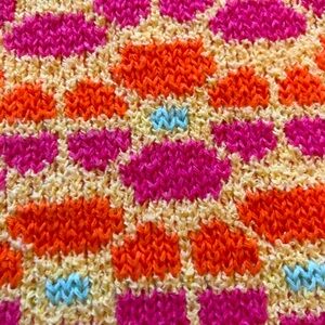 Vibrant knit vest with geometric pattern. Features yellow, orange, pink, and blue hues. Sleeveless design. Perfect for layering.