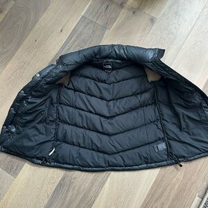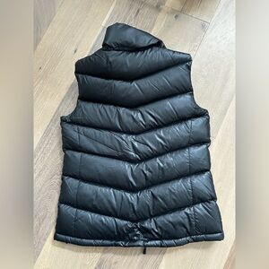 Sleek and warm quilted vest. Very puffy.Features a high collar, zip front and snap buttons. Black on black writing.