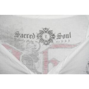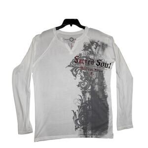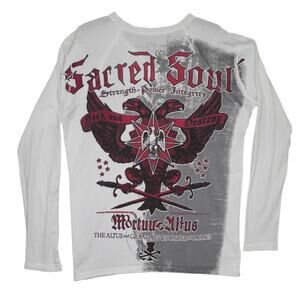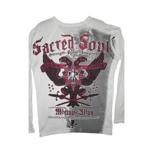 Turn heads in this edgy Sacred Soul long sleeve tee featuring heavy gothic/tattoo-style prints front and back. Iconic double eagle, scroll banners, and distressed effects bring strong 2000s Y2K streetwear vibes. Printed on soft white cotton with a split v-neck, Made in USA, size L.