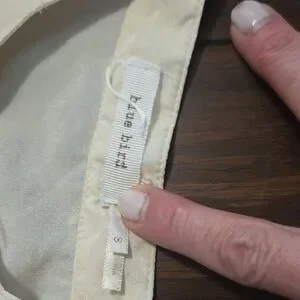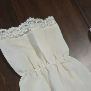 Elegant blouse with lace panels. Button-up front and tie waist. Long sleeves with lace trim.