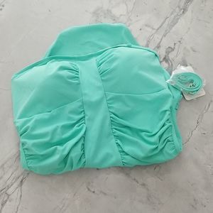 Elegant one-piece swimsuit. Features ruched detailing. Perfect for beach or pool.