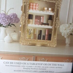 Show off your faves in major glam style! The gilded display shelf features ornate gold frame that instantly upgrades your space. Perfect for makeup, mini collectibles or decor accents. Versatile enough to use on a tabletop or hang on the wall.