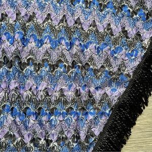 Shimmery blue & purple crochet material, black fringe, deep scoop shape