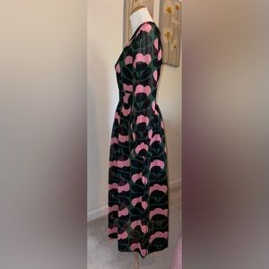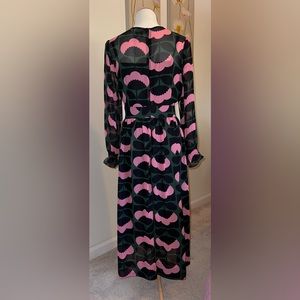 Chic midi dress with bold floral pattern. Long sleeves with ruffle cuffs. Perfect for any occasion.
