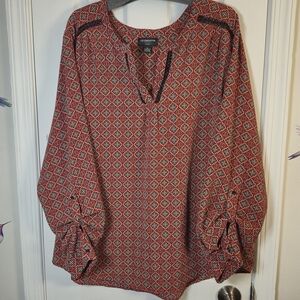 Liz Claiborne 3X Coral Black Geometric Tunic Top Roll Tab Sleeve Boho