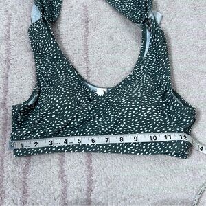 Stylish green swim romper with polka dots. Perfect for poolside or beach lounging.