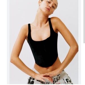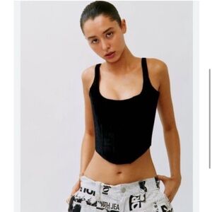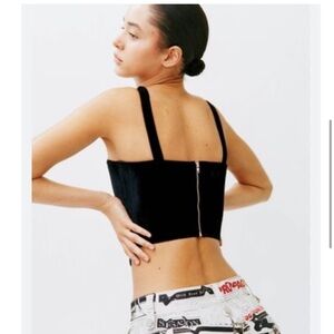 The Cindy Corset is a corset style top featuring boning, a curved neckline and hem with a silver hardware zip closure.