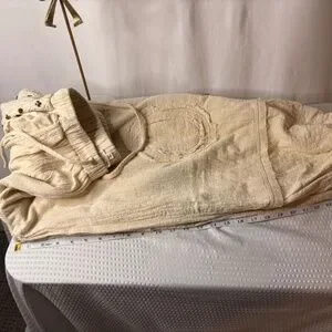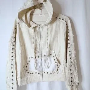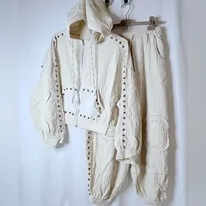 Stylish cream hooded set. Features stud embellishments. Includes hoodie and pants. Comfortable and chic. Never worn by me. I lost some weight from surgery and can’t wear it.