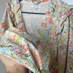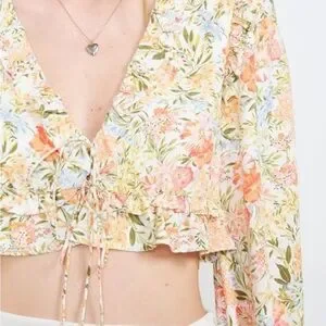 Emory Park floral ruffle tie-front blouse in size Large. Features a romantic garden floral print with cascading ruffle trim, deep V neckline, and adjustable front tie closure. Cropped silhouette with long sleeves and ruffle cuffs.