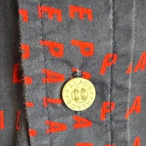 Casual button-down shirt by PALACE. Features a navy base with red written Palace checkered design. Ideal for everyday wear.
