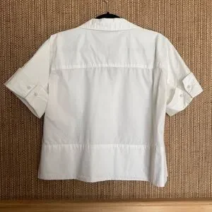 Julia Amory The Antibes Shirt in white, size S. Best-selling style currently sold out. Elevated short-sleeve button-down featuring a broad collar and signature French cuffs for a polished, tailored look. Designed with a relaxed, boxy fit and slightly cropped length to pair perfectly with high-waisted jeans or skirts. Runs large; consider sizing down. Crisp cotton feel. Excellent condition. Same day or next-day shipping.