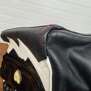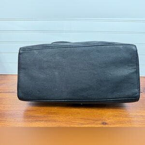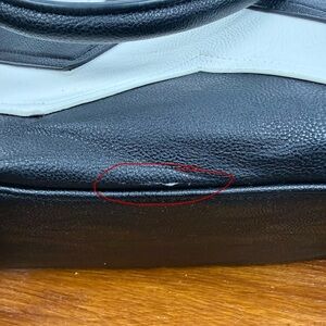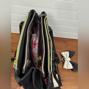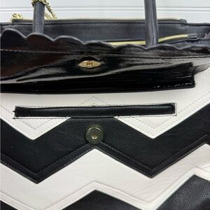 Betsey Johnson black & white shoulder chevron handbag purse with bow accent. This purse has pockets galore and lots of zippered compartments. I could not find any flaws in the floral lining, and all zippers work. The handles have no wear on them. I did find 2 very small spots of wear on the outside, these are very minor and you have to be looking for them to spot, see last 2 pictures. All in all, this is in very decent condition.