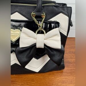 Betsey Johnson black & white shoulder chevron handbag purse with bow accent.