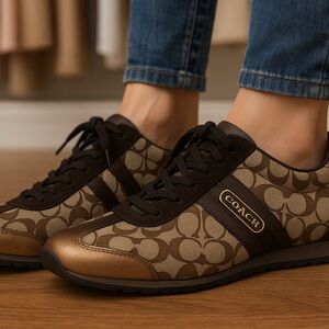 Chic Coach shoes with iconic logo design. Brown and tan color scheme.