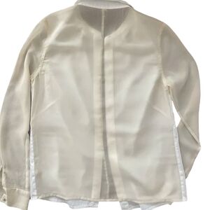 J Brand button-front blouse with white cotton body and sheer cream polyester contrast sleeves and back panel. Point collar, French cuffs with button closure. Hidden button placket.