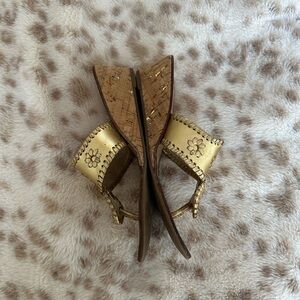 Jack Rogers wedge sandals in metallic gold.