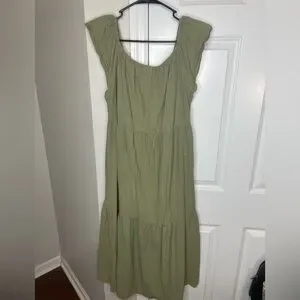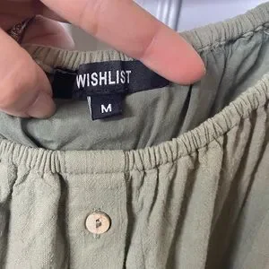 Wishlist sage green midi dress in size Medium. Soft 100% cotton fabric with a relaxed, flowy silhouette. Features a scoop neckline, functional button front detail, and tiered skirt for an effortless cottagecore look.