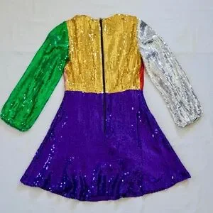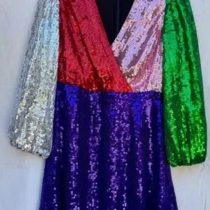 Vibrant sequin mini dress. Features multicolor blocky design. Long sleeves and deep V-neck style. Perfect for parties.