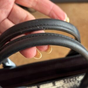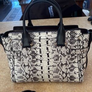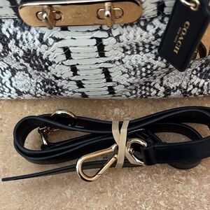 Stylish Coach satchel featuring a striking snakeskin pattern. Black handles and gold hardware add elegance. Perfect for any occasion.