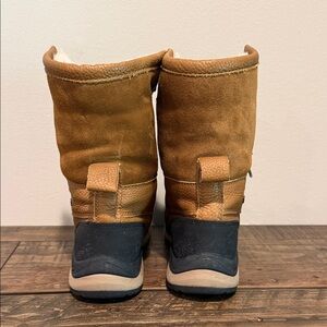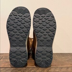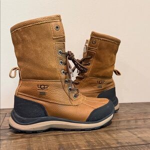 UGG boots with tan leather and black accents. Cozy fur lining. Sturdy lace-up design. excellent condition. Worn once.