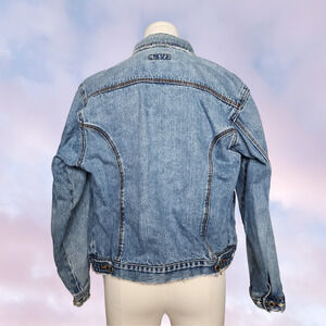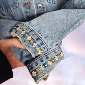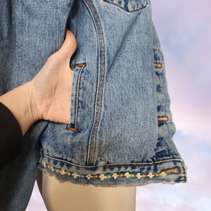 Vintage Vtg 90s Y2k 1of1 DIY Flower Trim Distressed Light Wash Denim Jacket. Very cute and unique denim jacket that has a light acid wash look to it. This jacket has flower trim along the top of the two front pockets as well as along the front / side bottom edge and sleeve cuffs. The previous owner may have added this touch. Adds a really unique touch to this simple piece. How the outside hand pocket has been put together it appears that it's created an inside pocket that could fit a phone or wallet if you choose.
