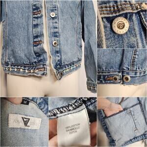 Vtg 90s Y2k 1of1 DIY Flower Trim Distressed Light Wash Denim Jacket Sz M