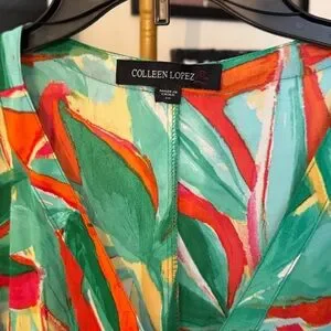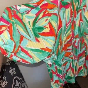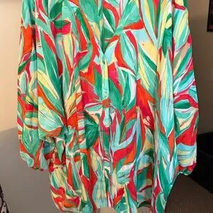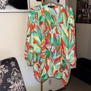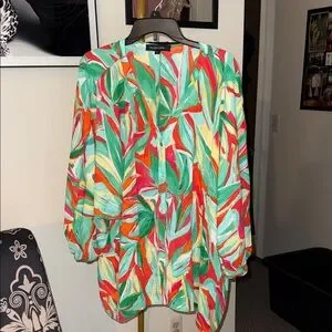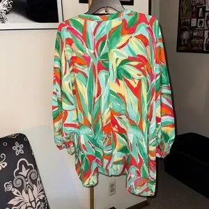 Bold blouse with a multicolor leaf design. Features orange, green, and red hues. Ideal for a vibrant look.