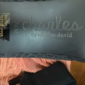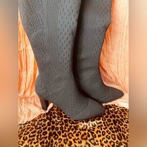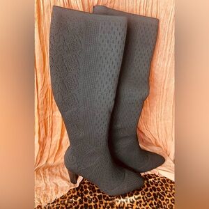These are Charles by Charles David knee high boots. The upper is a stretch pull on material that looks like sweater material. They are hard to find stacked high heels. 👠 🖤 ✨