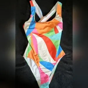 Vibrant one-piece swimsuit with an abstract design. Features a mix of orange, blue, pink, green, and white colors.