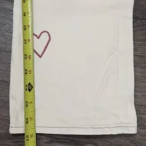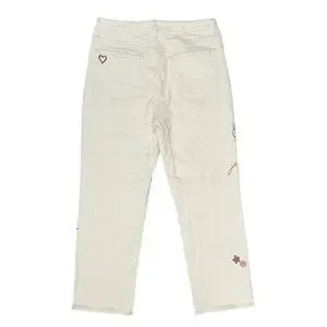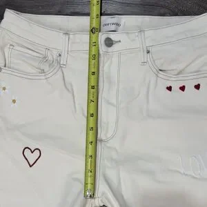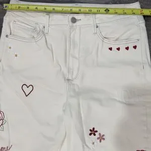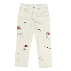 Driftwood, Royce, Love Notes, embroidered jeans, cream jeans, ivory denim, off white, straight leg, cropped, ankle, W29, L27, cotton spandex, hearts, roses, floral, LOVE, xoxo, lips, romantic, coquette, Valentine, boho, festival, statement denim