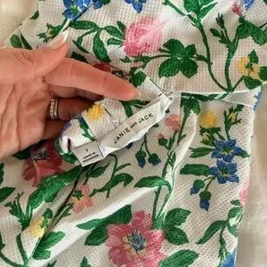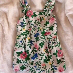 Cute romper with colorful floral design. Features pink, green, and blue flowers on a white base.